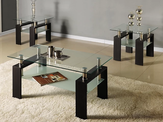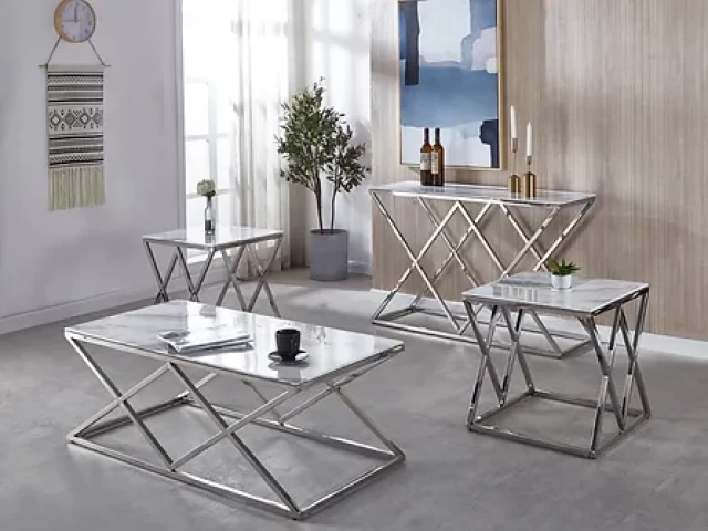 IF-2362 Coffee Table set $ 850.00 $ 950.00 Coffee Set with 8mm White Marble Glass and Chrome Legs Sofa Table is Optional